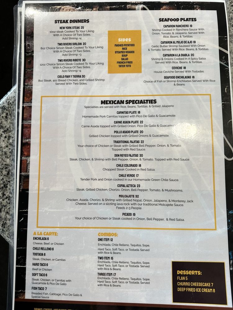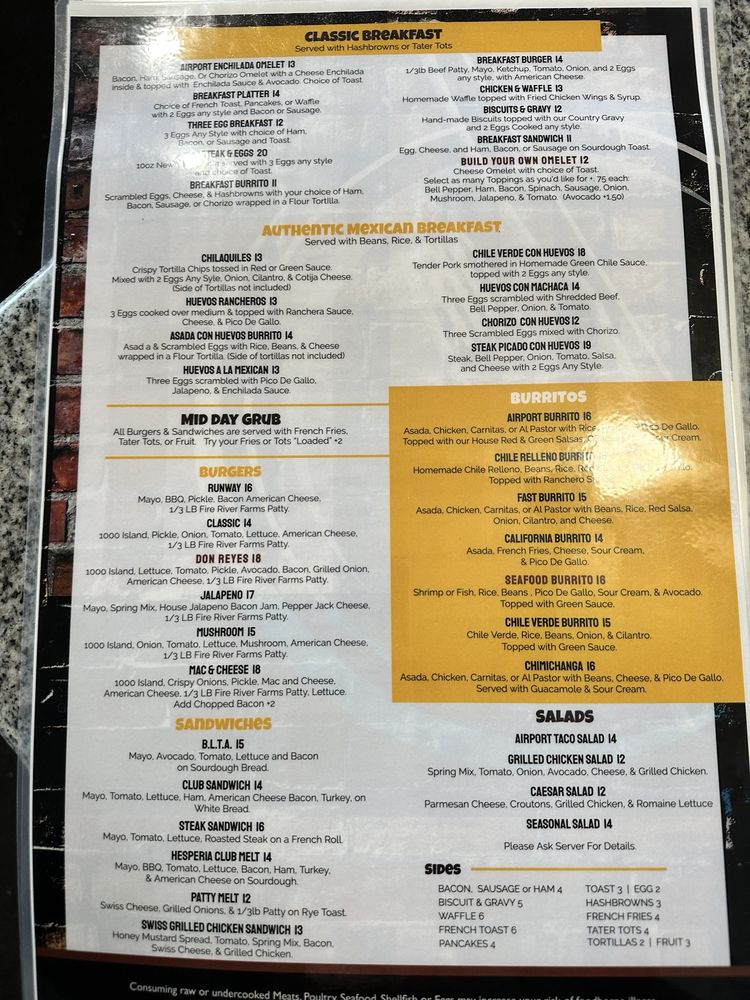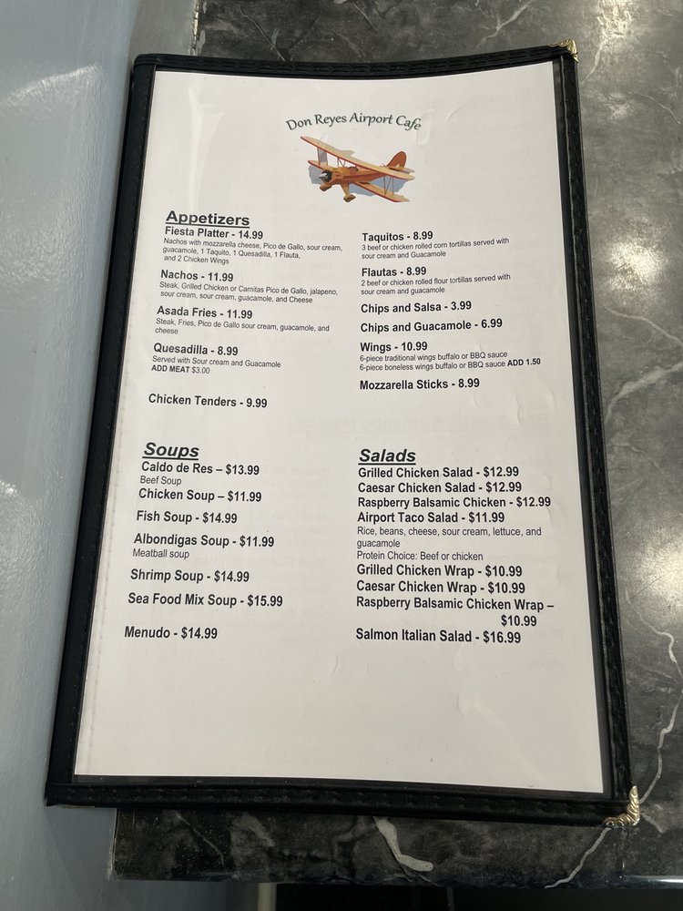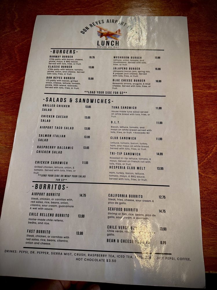 Don Reyes Airport Cafe, a hidden gem located in Hesperia, CA, offers a variety of Mexican dishes such as carnitas plates, burritos, and customizable combos. Customers rave about the flavorful food, with reviews highlighting the delicious salsa fresca and chile verde. The relaxed atmosphere and friendly service make this spot a go-to for locals, with options for outdoor seating and drive-thru service. The menu caters to different preferences, from meat lovers to seafood enthusiasts, ensuring there is something for everyone. Don Reyes Airport Cafe stands out for its fresh ingredients, prompt service, and inviting ambiance, making it a must-visit for those craving authentic Mexican cuisine in a unique setting.